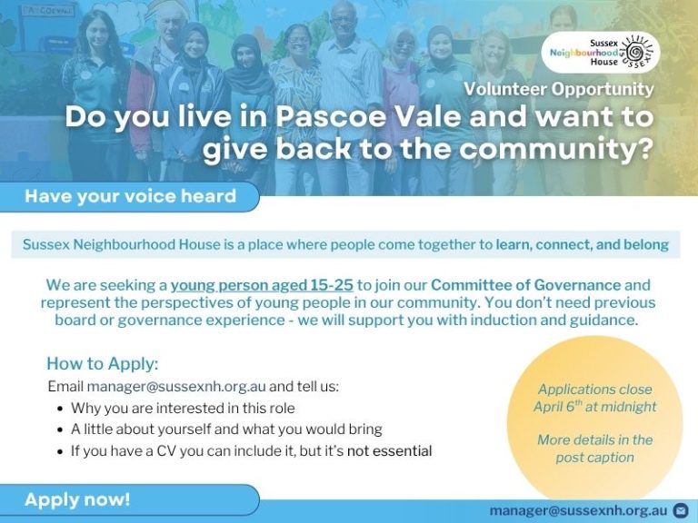 We’re Recruiting Volunteer Committee of Governance Members Sussex Neighbourhood House is a place where people come together to learn, connect and belong. We’re seeking 3 volunteers to join our Committee of...